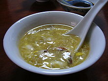 Double steaming, sometimes called double boiling, is a Chinese cooking technique to prepare delicate food such as bird's nest soup and shark fin soup. The food is covered with water and put in a covered ceramic jar and the jar is then steamed for several hours. This technique ensures there is no loss of liquid or moisture (its essences) from the food being cooked, hence it is often used with expensive ingredients like Chinese herbal medicines. In Cantonese, double steaming is called dun (simplified Chinese: ?; traditional Chinese: ?; pinyin: dun). The meaning of the Chinese character for dun in Cantonese is different from that in Mandarin, because dun means to simmer or stew in Mandarin. This technique is also common in Fujian, a neighbouring province of Guangdong (Canton). Cantonese cuisine is famous for its slow cooked soup. One famous dish of this kind is called the Winter melon urn (???). It is prepared by emptying the inside of a winter melon to make an urn. The outside of the winter melon is often carved with artistic patterns. The inside is then filled with soup ingredients such as Chinese cured ham, and several Chinese herbs. The whole urn completed with its original melon lid is double steamed for at least four hours. The flavour of the soup is soaked into the flesh of the melon. The whole melon and its content is brought to the dinner table. The soup is served by scooping out the liquid and the inside wall of the melon. In this case, the edible melon takes the place of the double steaming jar. This application is possible because winter melon has a waxy, and thus waterproof, rind. Winter melon is believed to be nourishing and it is seldom cooked with ingredients that are believed to be too yin or too yang. There is another dessert dish called double steamed frog ovaries in a coconut (??????), which is recommended for women. The Chinese medicinal ingredients (including hasma), spices, and rock sugar are placed inside a young coconut to soak in the original coconut juice. The filled coconut is then double steamed for several hours. The whole coconut is served whole at the table after dinner. The contents and the inside wall of the coconut are scooped out to be consumed.