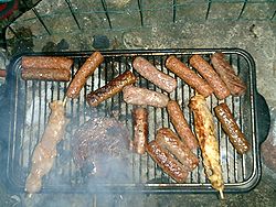 Asia In Japanese cities, a yakitori cart, restaurant, or shop with charcoal-fired grills and marinated grilled meat on a stick can often be found. Yakiniku, is a type of food where meat and/or vegetables are grilled directly over small charcoal or gas grills at high temperatures (this style of cooking has become widely popular throughout Asia).In Malaysia, Singapore, Indonesia, and Thailand, a popular food item from food vendors is satay, marinated meat on a bamboo skewer grilled over a charcoal fire and served with peanut (sate) sauce. Japanese traditional portable charcoal grill "Shichirin" Yakitori being grilled In Germany, the most prominent outdoor form of grilling is by using charcoal in a kettle. Besides charcoal, sometimes gas and electric heat sources are used, too. Other methods are used less frequently. Risks of grilling As is true of any high-temperature frying or baking,[11] when meat is grilled at high temperatures, the cooking process can generate carcinogenic chemicals.[11][11][12]) Two processes are thought to be responsible. Heterocyclic amines - "HCAs are formed when amino acids, sugars, and creatine react at high temperatures."[11] Additionally, polycyclic aromatic hydrocarbons - "PAHs are formed when fat and juices from meat grilled directly over an open fire drip onto the fire, causing flames. These flames contain PAHs that then adhere to the surface of the meat. PAHs can also be formed during other food preparation processes, such as smoking of meats."[11] However it is possible to significantly reduce carcinogens when grilling meat, or mitigate their effect. * Garlic, rosemary, basil, mint, sage, savory, marjoram, oregano, olive oil, cherries, and vitamin E have been shown to reduce formation of both HCAs and PCAs[12]. Another method is pre-cooking the meat in the microwave, then draining meat juices so they do not fall onto flames, preventing release of PCAs.[12] Side dishes and drinks rich in antioxidants, such as tea, have also been shown to neutralize the toxins by mixing in one's stomach Grilled bratwurst In Argentina and Uruguay, both asado (beef roasted on a fire) and steak a la parrilla (beefsteak cooked on traditional grill) are staple dishes and even hailed as national specialities. [edit]UK, Commonwealth and Ireland In the United Kingdom, Commonwealth countries and Ireland, grilling generally refers to cooking food directly under a source of direct, dry heat. The "grill" is usually a separate part of an oven where the food is inserted just under the element.[8] This practice is referred to as "broiling" in North America. In Australia, grilling can refer to cooking food directly under a source of direct heat or with heat from below, as in the US. In electric ovens, grilling may be accomplished by placing the food near the upper heating element, with the lower heating element off and the oven door partially open. Grilling in an electric oven may create a large amount of smoke and cause splattering in the oven.[9] Gas ovens often have a separate compartment for grilling, such as a drawer below the flame.